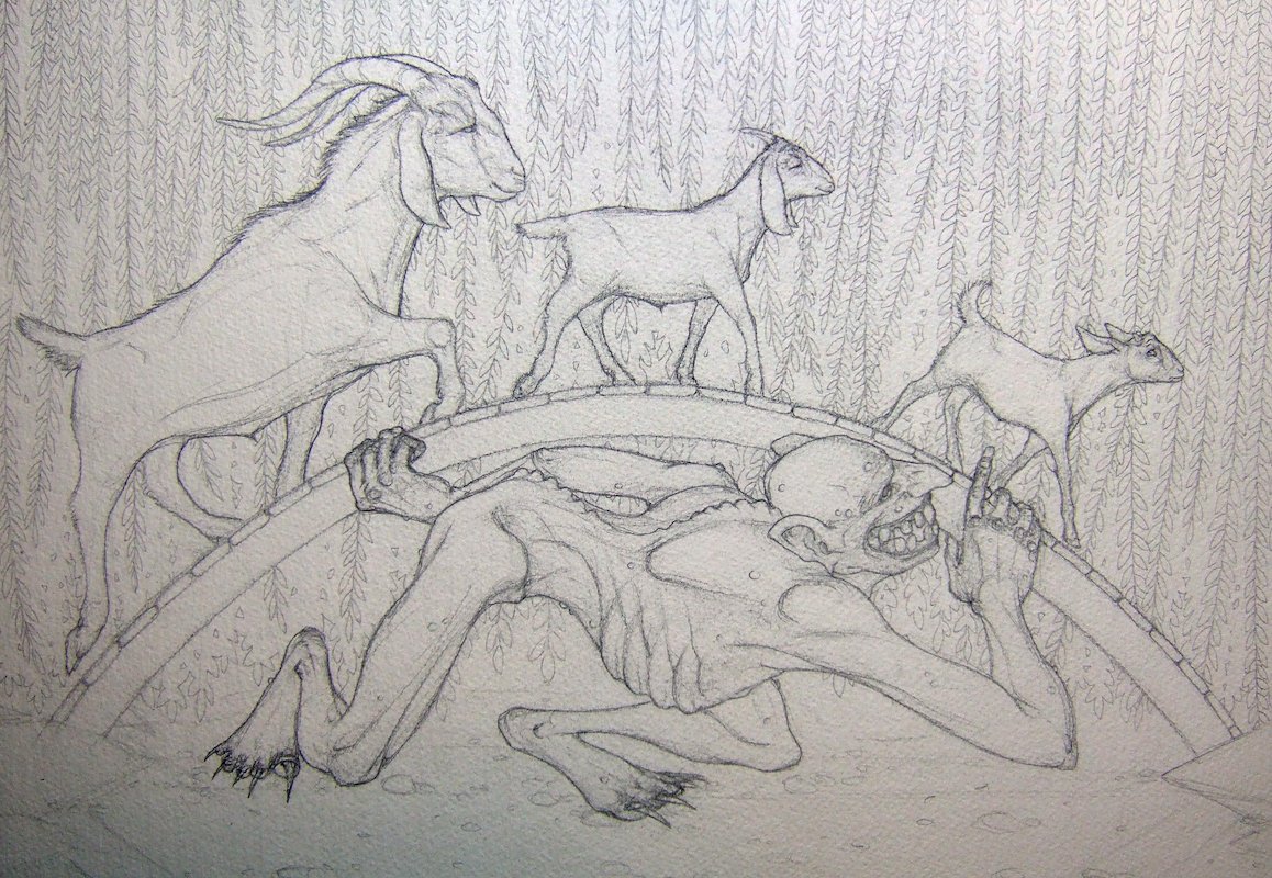 The troll has his sights set on a meal of the Three Billy Goats Gruff! This was the base drawing for a watercolor to be used as a book cover for a children’s book.
