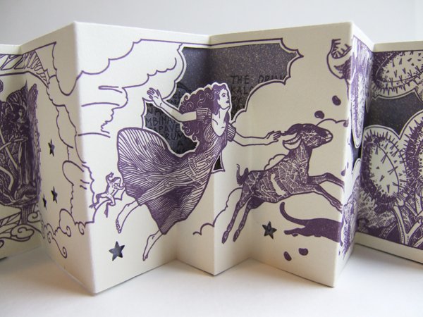Belladonna flies high in the sky with her familiars. In 2013 illustrator Frank Riccio and I collaborated on an edition of miniature popup books. The concept grew from our curiosity with European poison gardens and the observation that Atropa belladonna (Deadly Nightshade) and Datura stramonium (Hells Bells or Thorn Apple) were sisters in the Solonaceae family.