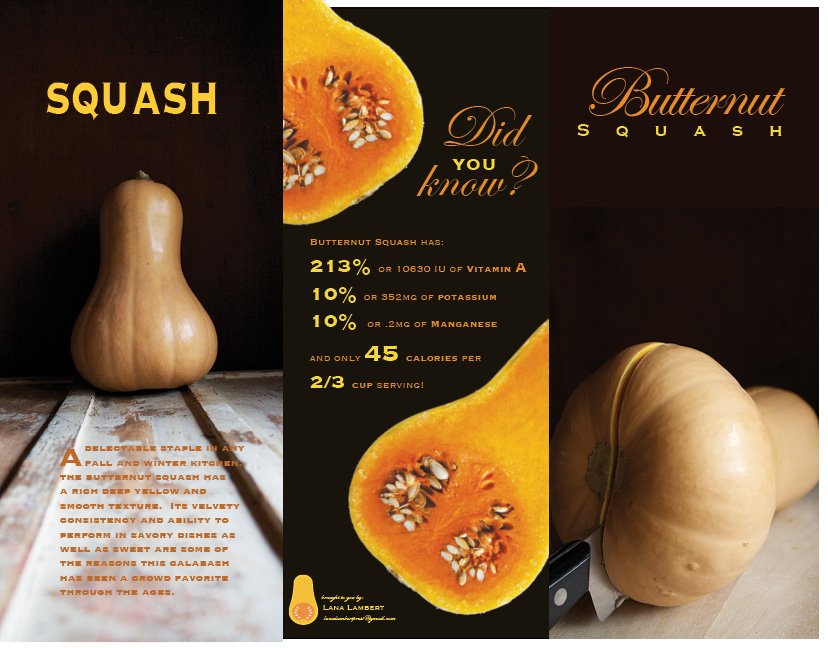 Fifty Shades of Butternut. There. I said it. This was put together as a class assignment to advertise a vegetable in a brochure. When the professor said not to pick an “unattractive” vegetable like a butternut squash or potato I knew what I had to do…